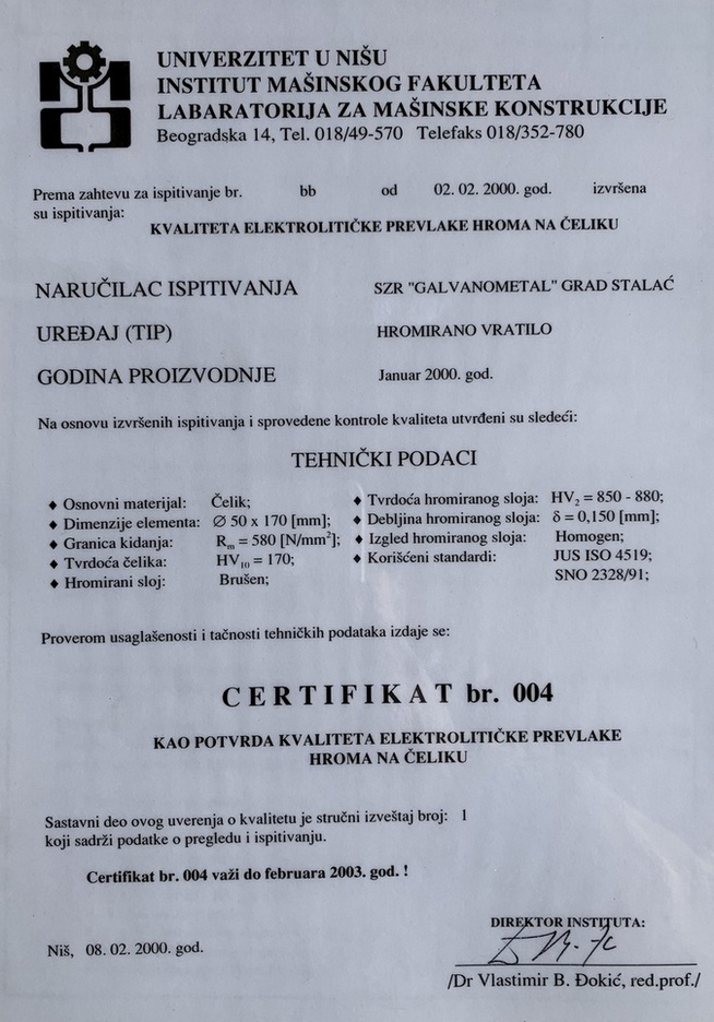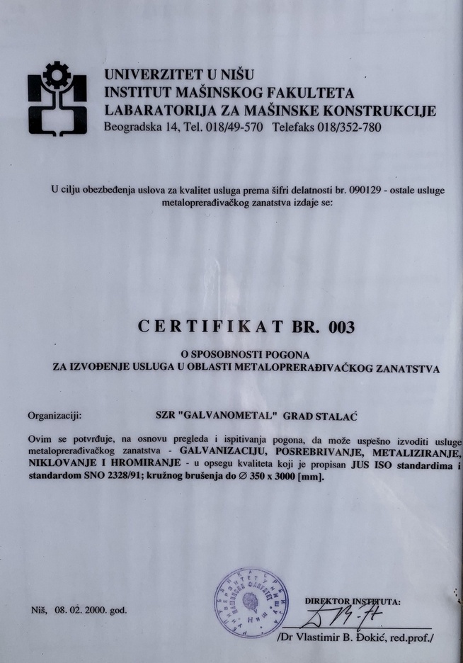 Rad Galvanometala je podržan sertifikatom za najviše vojne standarde Mašinskog fakulteta u Nišu, u opsegu kvaliteta propisanog JUS ISO standardima i standardom SNO 2328 /91.